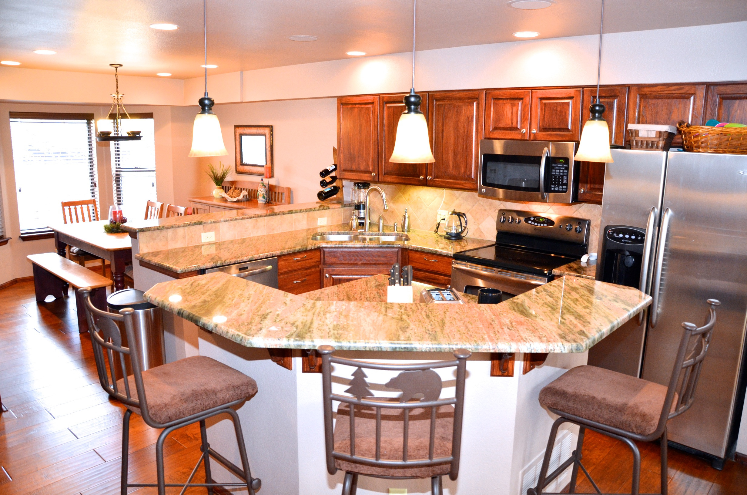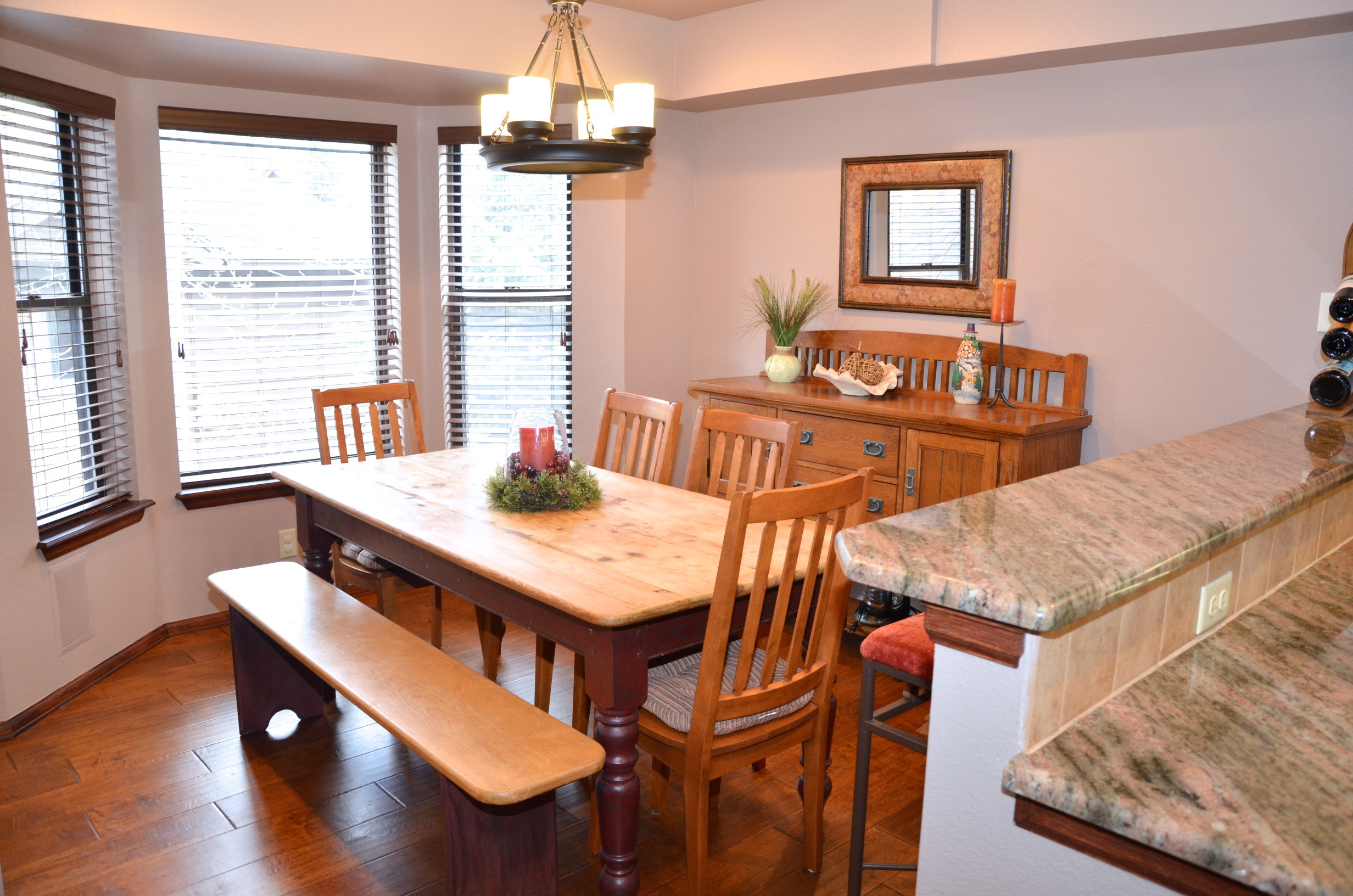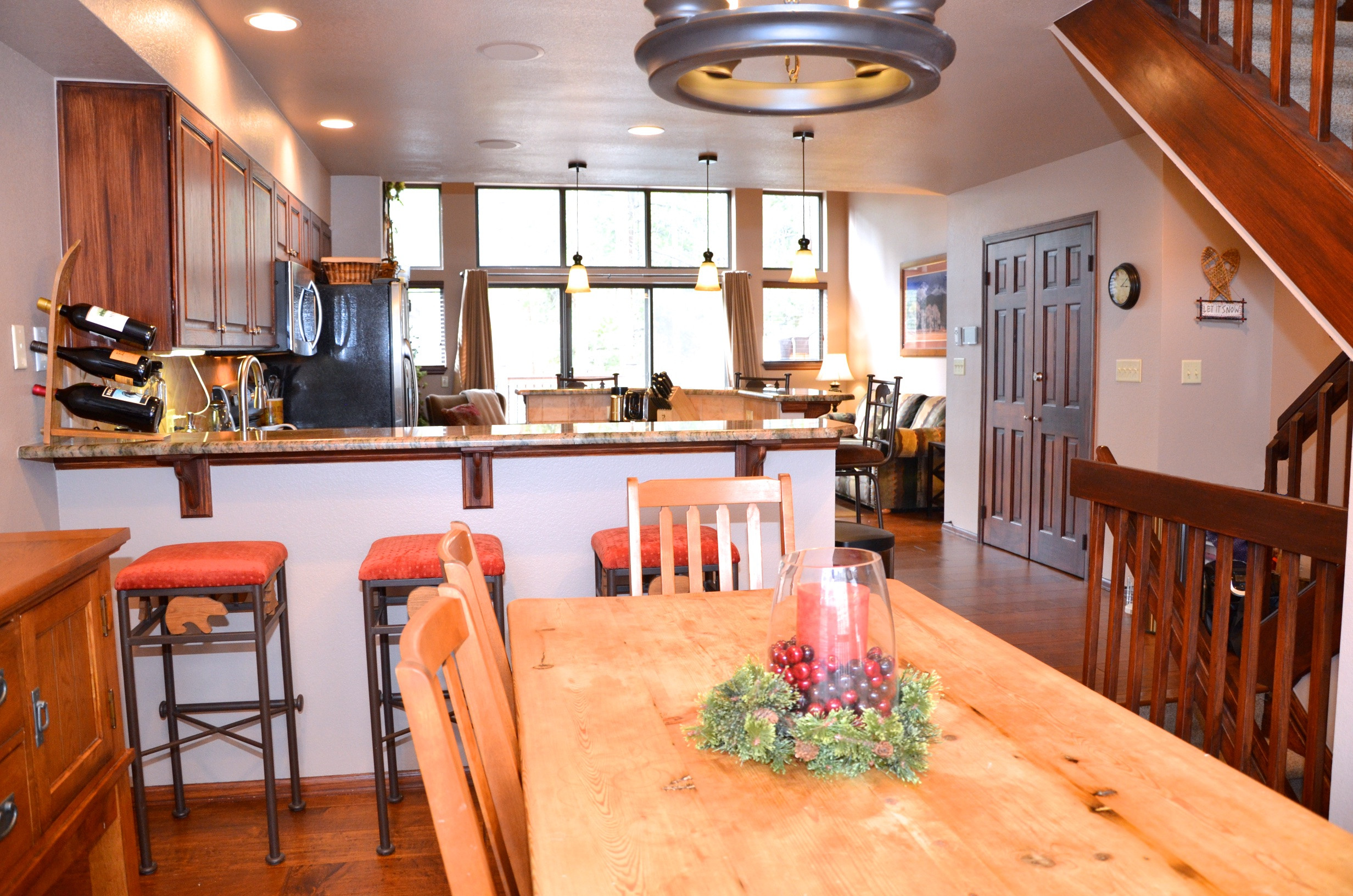 • Dining: Table seats 6, wrap-around granite bar seats 3