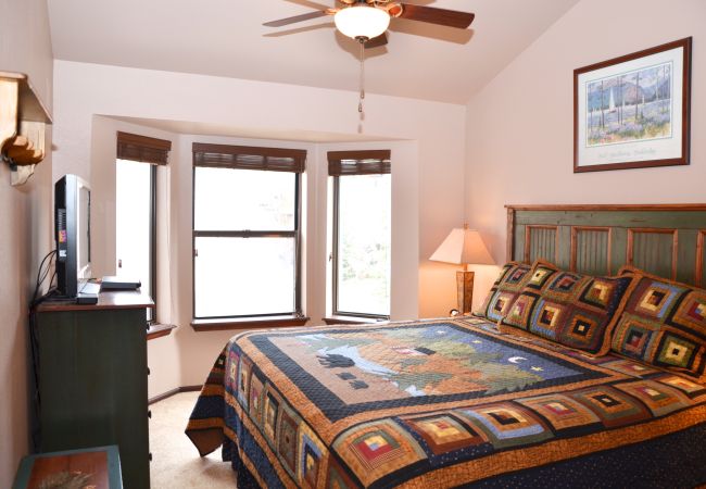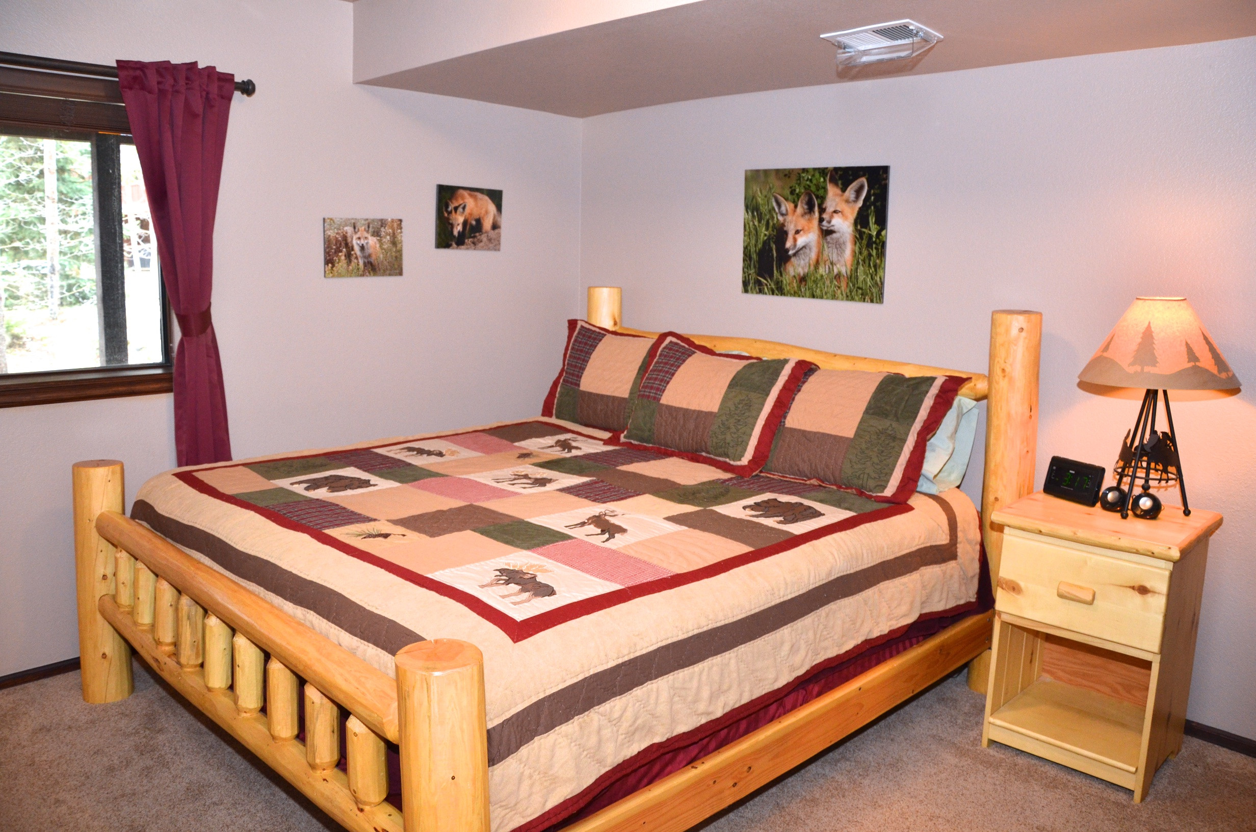 • Master bedroom (sleeps 2): King bed, vaulted ceilings, 48" TV, ensuite bath with tub, rain shower, blow dryer, and toiletries