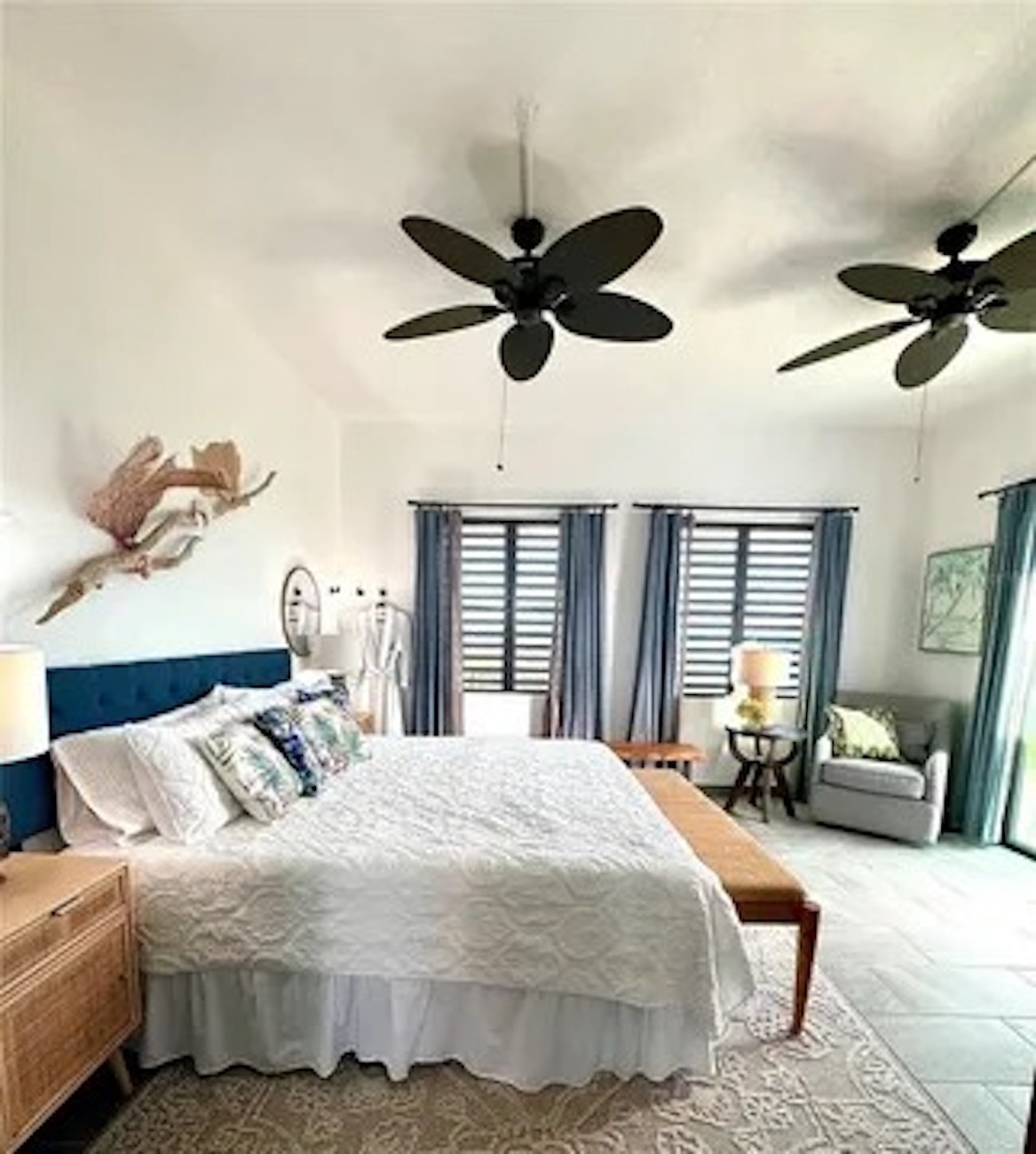 •Master bedroom: King bed, desk, outdoor soaking tub, and storm doors